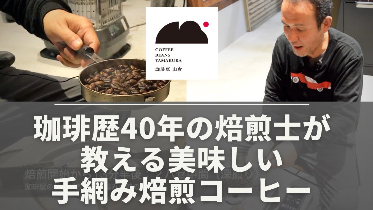 この動画は、「珈琲豆 山倉」の焙煎士が、手網み焙煎器とガスコンロを使ってグアテマラSHB(40g)の生豆を焙煎する手順を実演形式で紹介するものです。